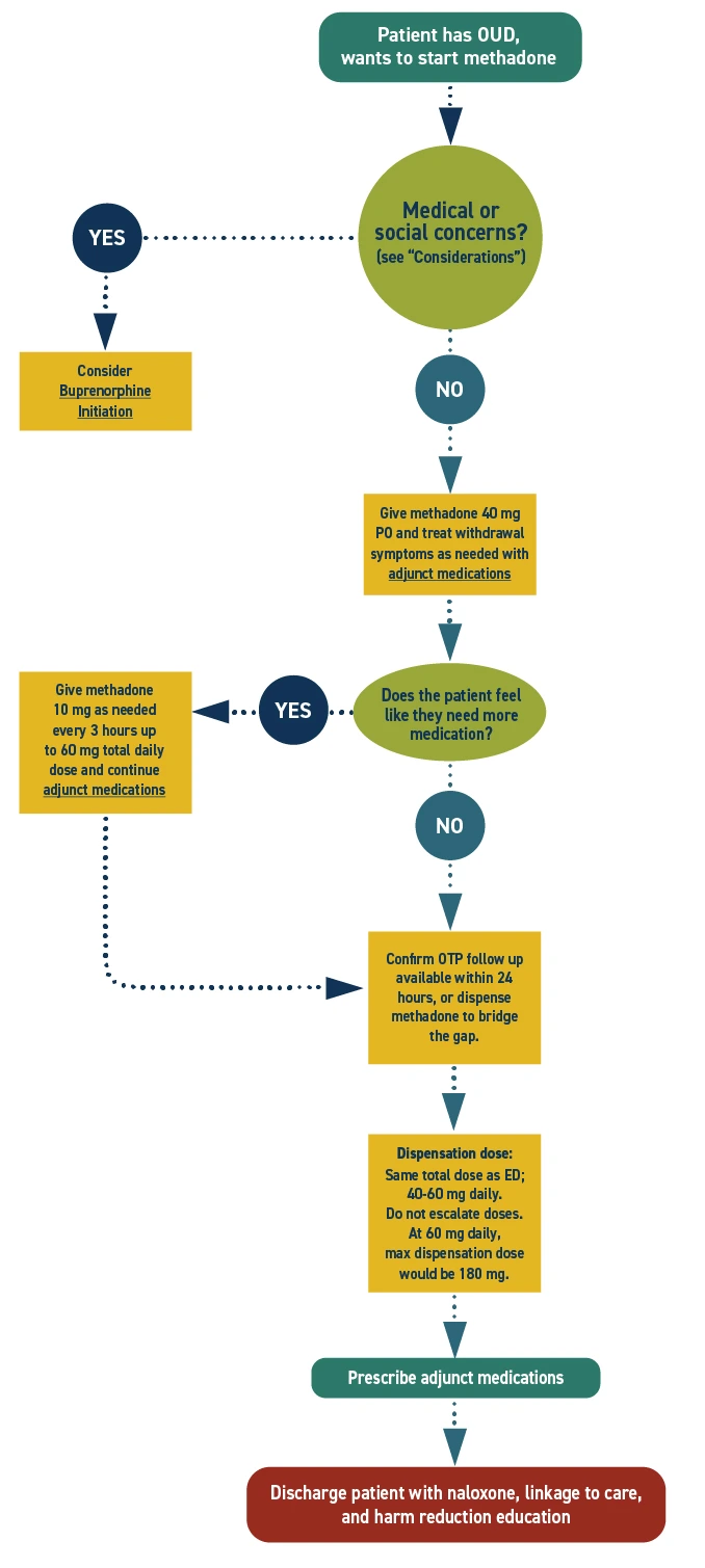 Don't start methadone unless the OTP can see the patient within 24 hours or there are available appointments or walk-in slots within 72 hours and your hospital has an established process for methadone dispensation.
